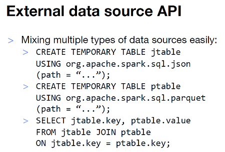 External data source API在支持了多种如JSON、Avro、CSV等简单格式的同时,还实现了Parquet、ORC等的智能支持;同时,通过这个API,开发者还可以使用JDBC将HBase这样的外部系统对接到Spark中。