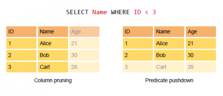 Column pruning。主要包括纵横的两种剪枝。在列剪枝中,Column pruning可以完全忽视无需处理的字段,从而显著地减少IO。同时,在某些条件查询中,基于Parquet、ORC等智能格式写入时记录的统计信息(比如最大值、最小值等),扫描可以跳过大段的数据,从而省略了大量的磁盘扫描负载。