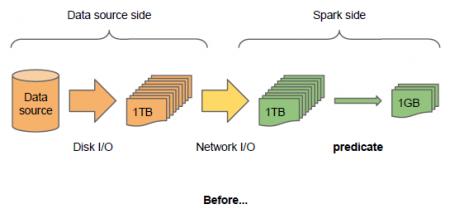 连城表示,在1.2版本之前,开发者其实已经实现了各种各样外部数据源的支持,因此,对比更原生的支持一些外部数据源,External data source API的意义更在于针对相应数据源进行的特殊优化,主要包括Column pruning(列剪枝)和Pushing predicates to datasources(将predicates贴近数据源)两个方面: