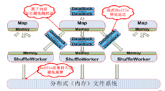 基于这些问题,百度设计了基于内存的PUSH模式。新模式下,Map输出的数据将不落磁盘,并在内存中及时地Push给远端的Shuffle模块,从而将获得以下提升:
