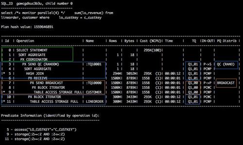 4个蓝色的PX进程作为消费者接收了customer的1.5M行记录(第 6 行),和lineorder的3亿行记录(第10行),进行hash join(第5行),预聚合(第4行)。
