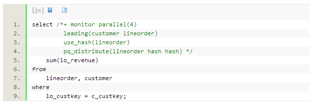 除了broadcast分发方式,另一种常见的并行分发方式为hash。为了观察使用hash分发时sql的 执行情况,我对sql使用pq_distributehint 。