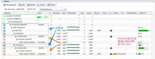 - 红色的PX进程作为生产者,并行扫描li neorder(第12~13行),对于连接键l o_custkey运用同样的dhash函数,通过tablequeue1 ,发给4个蓝色消费者的其中一个(第11行)。同样的hash函数保证了customer和li neorder相同的连接键会发给同一个消费者,保证hashj oin结果的正确。因为3亿行数据都需要经过hash函数计算,然后分发(这是进程间的通信,或者需要通过RAC心跳网络通信),这些巨大的额外开销,就是增加38% cpu的原因。