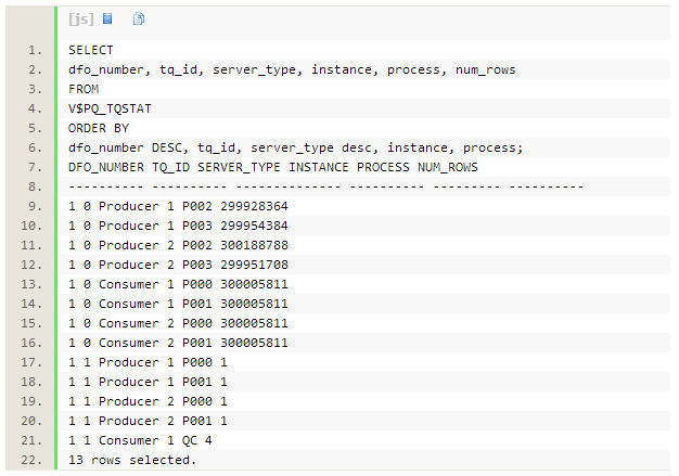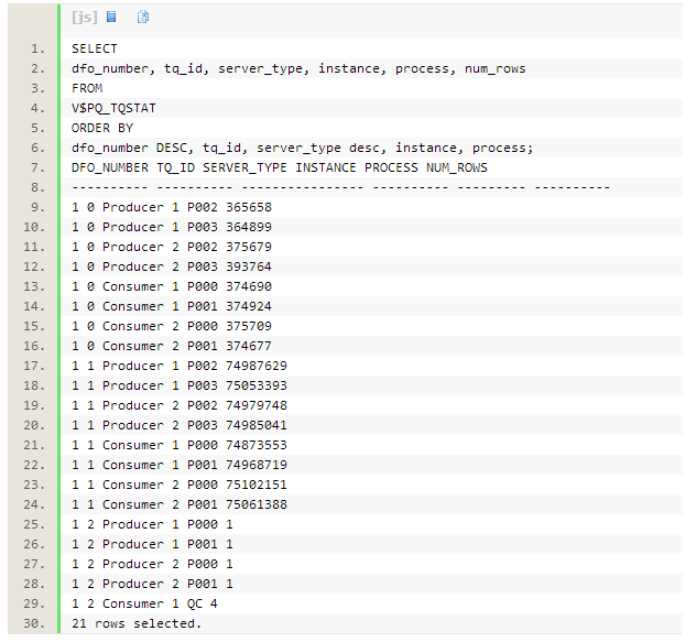 个tablequeue0/1/2,V$PQ_TQSTAT包含21行记录。