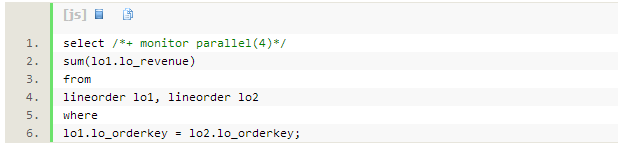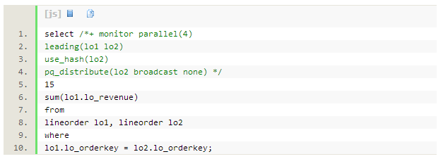我们使用lineorder上的自连接来演示,为什么有时hash分发是唯一合理的选择。测试的SQL如 下: