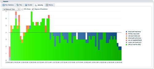 因为涉及3亿行数据的分发和接收,作为生产者的红色PX进程和作为消费者的蓝色PX进程需要同时活跃,SQL monitor报告中的activity信息显示大部分时间,AAS超过并行度4,意味这两组PX进程同时工作。不像replicate或者broadcast分发时,AAS为4,只有一组PX进程保持活跃。