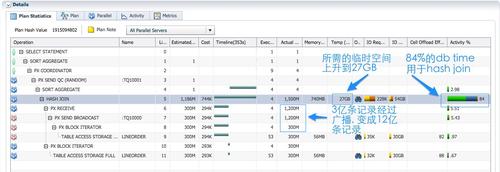 第5行的hash join的所消耗的临时表空间上升到27GB,临时表空间IO占的db time的38%。因为每个蓝色PX进程进行hash join的数据变大了,hash join的左边为3亿行数据,hash join的右边为3亿行记录的1/4.