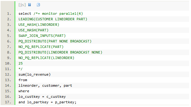 - 进行第5行的hash join操作时,每个PX进程需要连接60k行customer记录和75M行lineorder记录。Join操作的成本大幅增加。