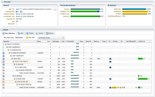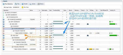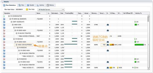 因为使用星型模型测试,这个例子使用Broadcast分发或者replicate才是合理的。实际应用中,连续的hash分发并不一定会出现HASH JOIN BUFFERED这个阻塞点,如果查询涉及的表都较小,一般不会出现HASH JON BUFFERED。即使执行计划中出现BUFFER SORT,HASH JOIN BUFFERED等阻塞操作,也不意味着执行计划不是最优的。如果sql性能不理想,HASH JOIN BUFFERED操作消耗了大部分的CPU和大量临时空间,通过sql monitor报告,你可以判断这是否是合理的: