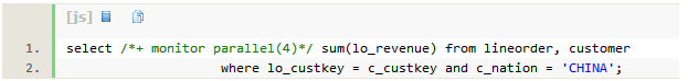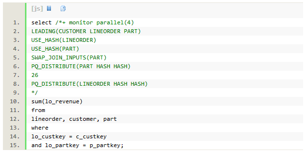 测试三个表连接的sql如下,加入part表,使用hint让优化器两次hash join都使用broadcast分发。Replicate SQL查询性能类似。