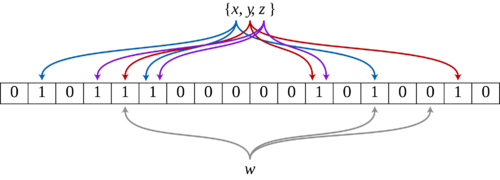 一个空的布隆过滤所有bit都为0。增加一个元素时,该元素需要经过三个hash函数计算, 得到3个hash值,把数组中这三个位置都置为1。集合{x,y,z}的3个元素,分布通过三次hash计算,把数组9个位置设置为1。判断某个元素是否属于一个集合,比如图中的w, 只需对w进行三次hash计算产生三个值,右边的位置在数组中不命中,该位置为0,可以确定,w不在{x,y,z}这个集合。由于存在hash碰撞,布隆过滤的判断会过于乐观(false positive),可能存在元素不属于{x,y,z},但是通过hash计算之后三个位置都命中,被错误认定为属于{x,y,z}。根据集合元素的个数,合理的设置数组大小m,可以把错误判断的几率控制在很小的范围之内。