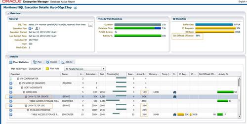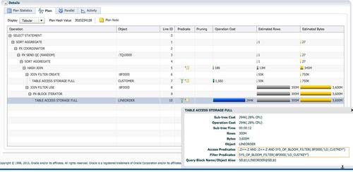 - 布隆过滤的使用:实例1和2的4个红色的PX进程作为生产者,并行扫描lineorder时使用 合并之后的布隆过滤进行过滤。Lineorder过滤之后为49M行记录,此时的布隆过滤似乎没有replicate时的有效。Cell Offloadload Efficiency为97%。