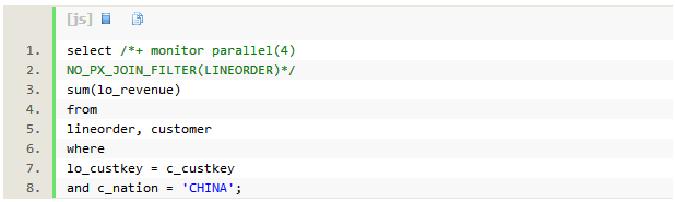 接着,我们通过hint NO_PX_JOIN_FILTER,禁用布隆过滤,观察此时的sql执行性能。