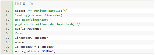 执行计划中出现第10行对LINEORDER的扫描时,使用了布隆过滤条件:SYS_OP_BLOOM_FILTER(:BF0000,"LO_CUSTKEY")