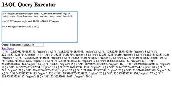 <html> <head> <title>JAQL Query for Chicago Traffic Tracker</title> <script src="jquery.js"></script> <script src="work.js"></script> </script> </head> <body> <h1>JAQL Query Executor</h1>