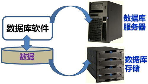 数据库系统通常由数据库软件、运行数据库软件的数据库服务器硬件以及保存数据库数据的数据库存储硬件(即共享存储)组成,如下图所示: