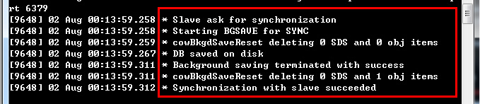 (3)再来看看Master和Redis的服务的cmd窗口,是不是又多了一些日志信息:Master将1个changes写入数据快照文件,发送给了Slave。而Slave也将这个change存入自己的数据文件并保存,也就使得{testkey,edisonchou}的这个数据在两个Redis服务中都有了,或者说在Slave中成功复制了Master中的这个key/value对。