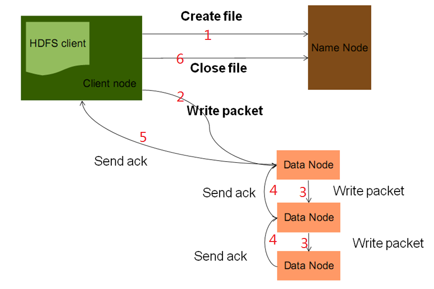 写入数据流程: 客户端首先在NameNode中创建文件, 然后将文件内容写到DataNode中, 完成后返回客户端,