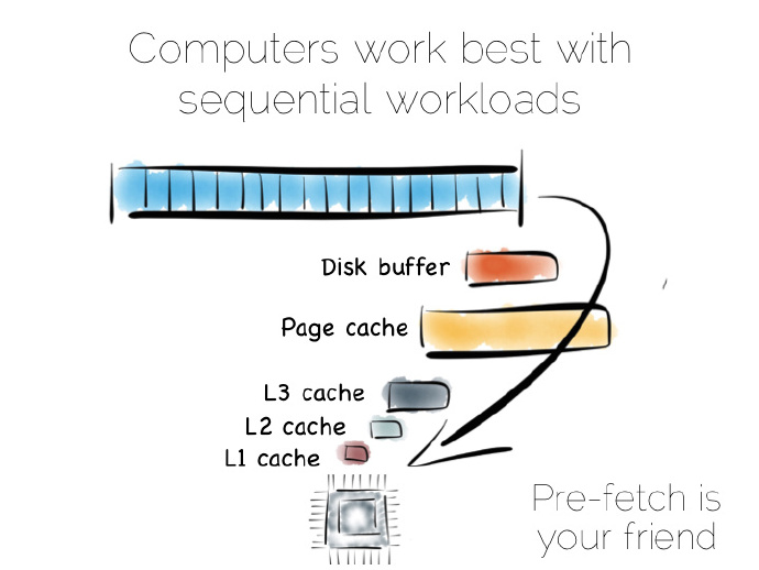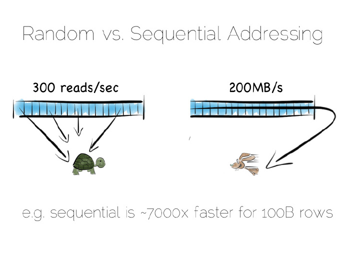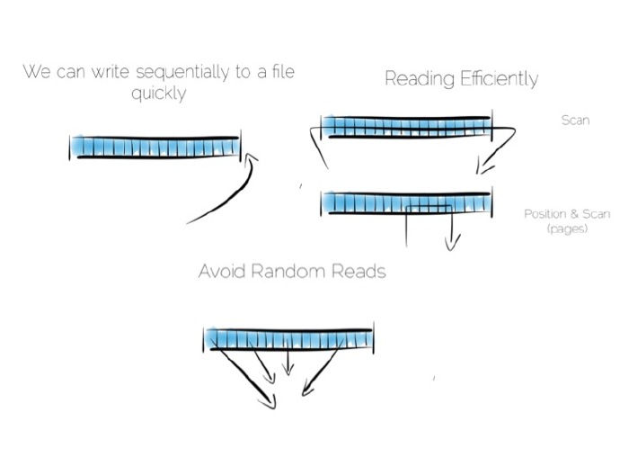 保持有序读和写,文件在硬件上会表现地很好。我们可以将写入的数据放入文件的末尾,可以通过扫面整个文件进行数据读取。任何我们希望的处理过程可以随着数据流穿过CPU而成真,比如过滤,聚合、甚至做一些更复杂的操作,总之非常完美。