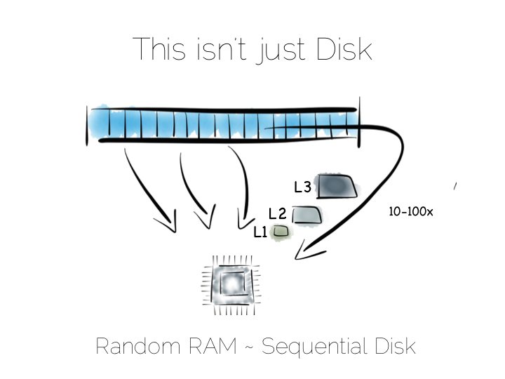 从硬盘有序获取的数据流性能确实好过随机寻址主内存,或许硬盘并不像我们想的那样跟乌龟似的,至少在有序获取的情况不会很慢。固态盘(SSD),特别是采用PCIe接口,正如它们显示不同的权衡,将事情复杂化。但采用这两种获取模式带来的缓存收益是不变的。