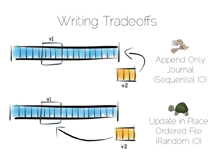 我们第一次做出权衡,将“日记”或者“日志”放在文件末尾,就能保证有序获取进而提高性能。另外倘若某处需要更新数据,可以实现每秒300次左右的读取,前提是更新数据刷入底层介质中。