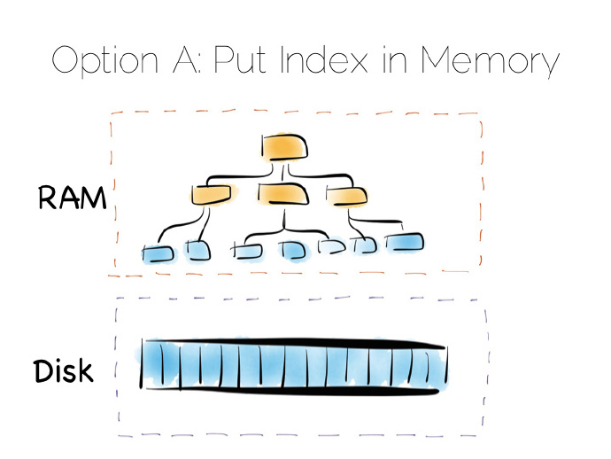 第一种方案是将索引放入主内存,随机写问题分隔到随机存储存储器(RAM),堆文件依旧在硬盘中。