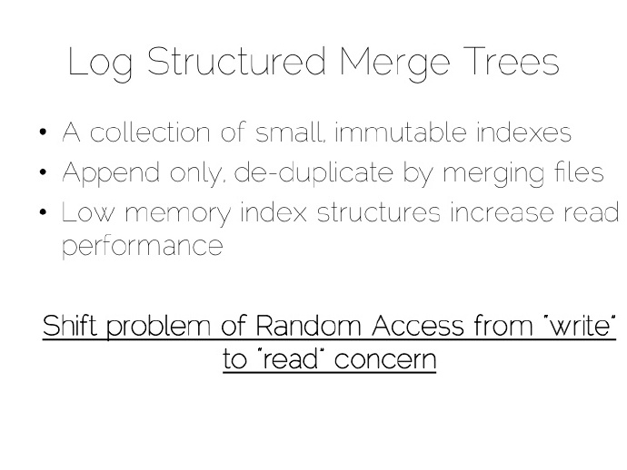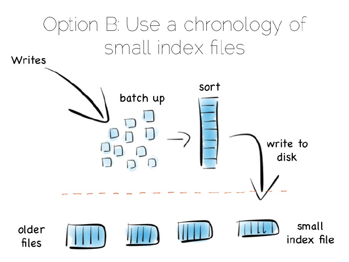 这是一个简单的理念:数据进来,我们批量地将其写入主内存。一旦内存数据足够多,比如达到MB,我们就对它们进行排序,而后将它们作为单个小的索引写入硬盘中。最后得到的是一个小的、由不变索引文件组成的年表。