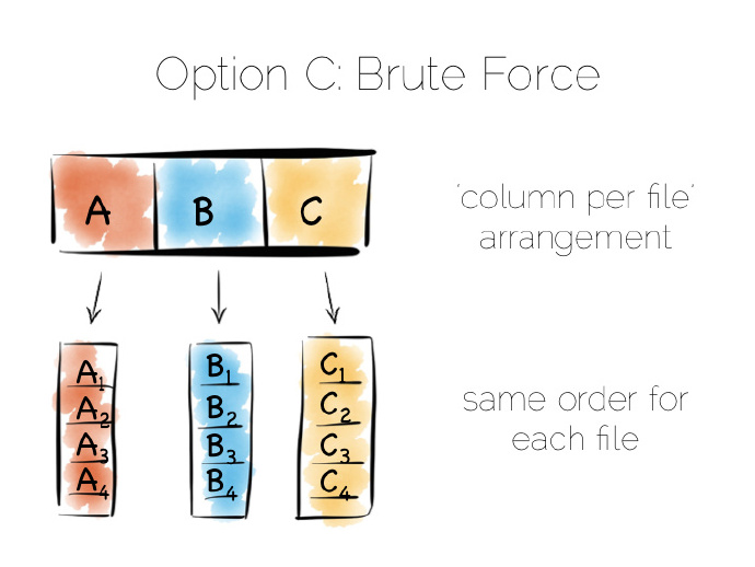 回到开始的文件例子,完整地读取它。如何处理文件中的数据,可以有许多选择。简单匹配算法(brute force)通过列而非行来存储数据,这种方法叫做面向列。