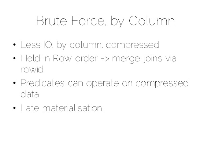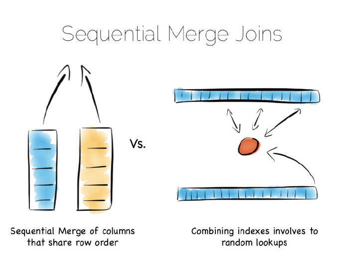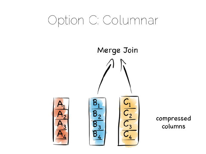 这和先前提到的“堆文件和索引(‘heap file & index)”方式不同,很好的理解这一点可以问自己,诸如此类的列方式和每一个字段带有索引的“堆和索引”方式有什么不同?