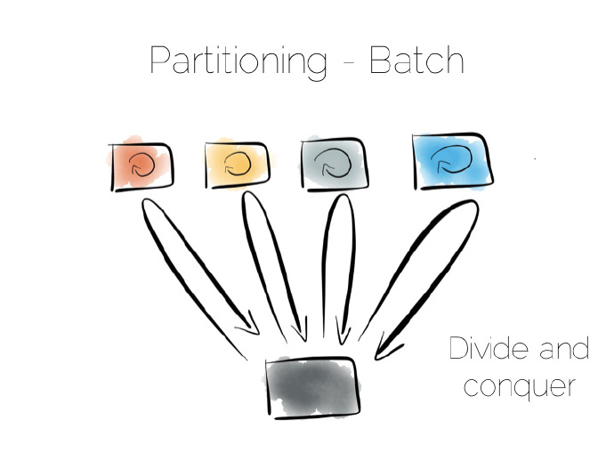 利用分区提供并行批量计算,比如聚合函数或者诸如聚众或者机器学习的复杂算法。最大的不同是所有的计算机在同一时刻采用广播的方式,在很短的时间采用分治的策略解决大规模计算问题。