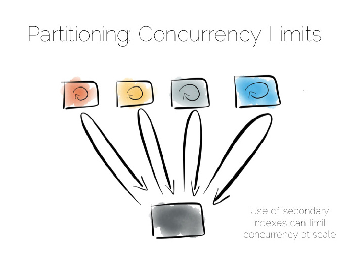 二级索引有别于主键索引,这就意味着数据分区不再借助索引中的值。不再使用哈希函数直接分发,而是广播请求给所有的计算机。这会制约并发,任何一个节点与每一个请求都有关。