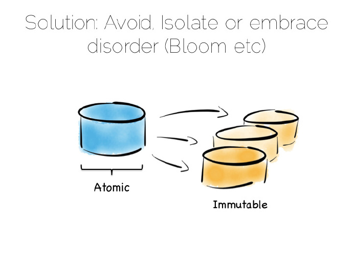 在数据平台中移除所有一致性需求、或者隔离它都是很有用的。一种隔离方式是利用单个写原则,涉及几个方面,比如Datomic;另一种方式是拆分可变的和非可变的来隔离一致性需求。