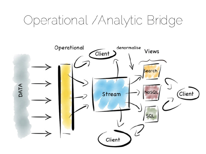 另一种相似的方式是操作分析桥(Operational/Analytic Bridge),利用单个事件流拆分最佳读以及最佳写视图。流处在一种不断变化的状态,因此异步视图可以在随后的日子里被重写和增强。