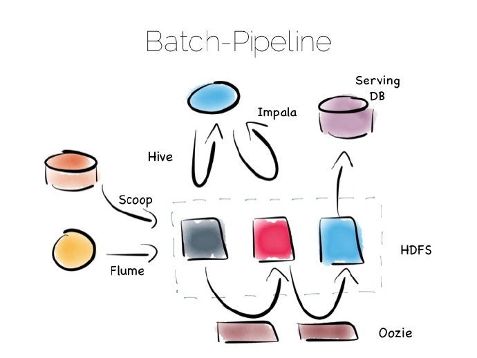 批量管道从多种资源中获取数据,将其放入HDFS,接着对其进行处理,进而提供一个原始数据持续优化的版本。