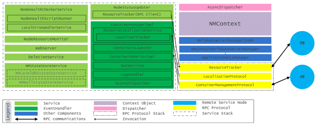 上图中NM内部各个组件(Dispatcher/EventHandler/Service)的功能,可以查看源码,不再累述。