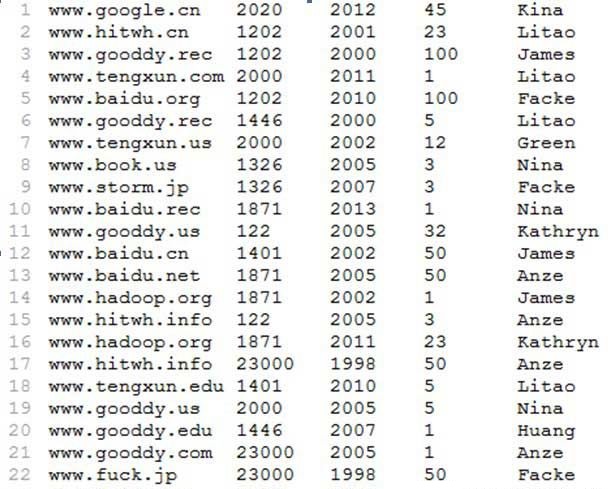 目前源数据从domain.log中读取,该log为人工构造,模拟域名拍卖的log,其中有五个字段,分别为domain(域名)、value(售价)、time(申请年份)、validity(有效期)、seller(卖家)。详细如下: