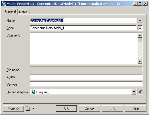 3)选择新增的CDM模型,右击,在弹出的菜单中选择“Properties”属性项,弹出如图所示对话框。在“General”标签里可以输入所建模型