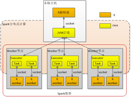 SparkR主要由两部分组成:SparkR包和JVM后端。SparkR包是一个R扩展包,安装到R中之后,在R的运行时环境里提供了RDD和DataFrame API。