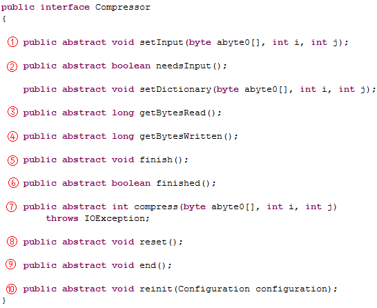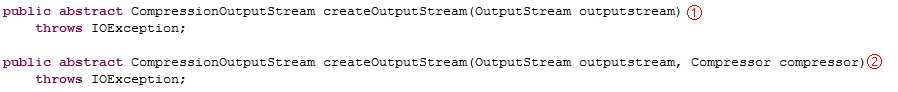 使用的是抽象工厂的设计模式。它是一个接口,制定了一系列方法,用于创建特定压缩解压算法。下面我们来看下比较重要的几个方法: