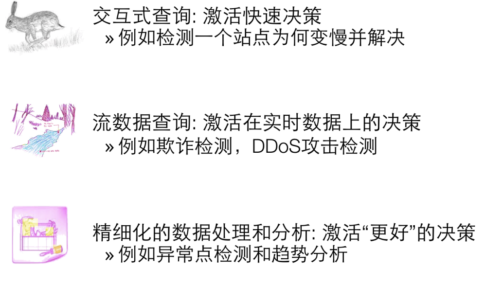 在实时数据上的低延迟查询,目的是帮助用户和应用程序在实时数据上做出决策,