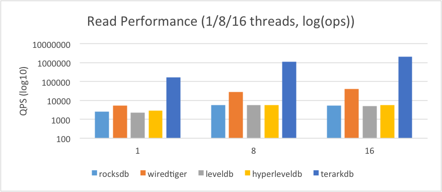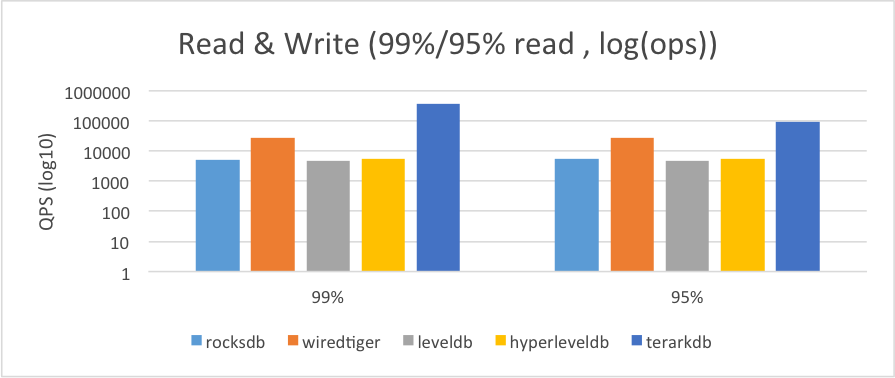 由于TerarkDB比其他数据库的数据高出太多,下面这幅图使用对数坐标,更便于查看数量级(请观察纵坐标轴)