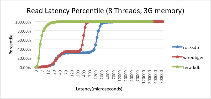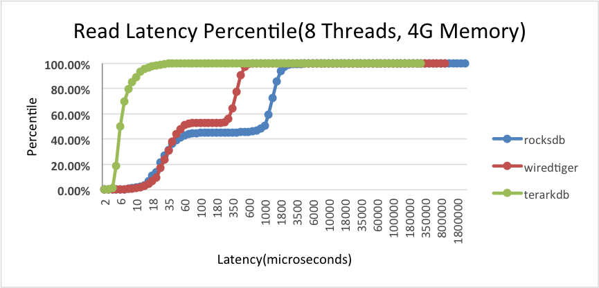 (1)横坐标表示延迟,数字的单位是微秒,坐标比例是近似对数的仔细观察横坐标的数字可以发现 TerarkDB