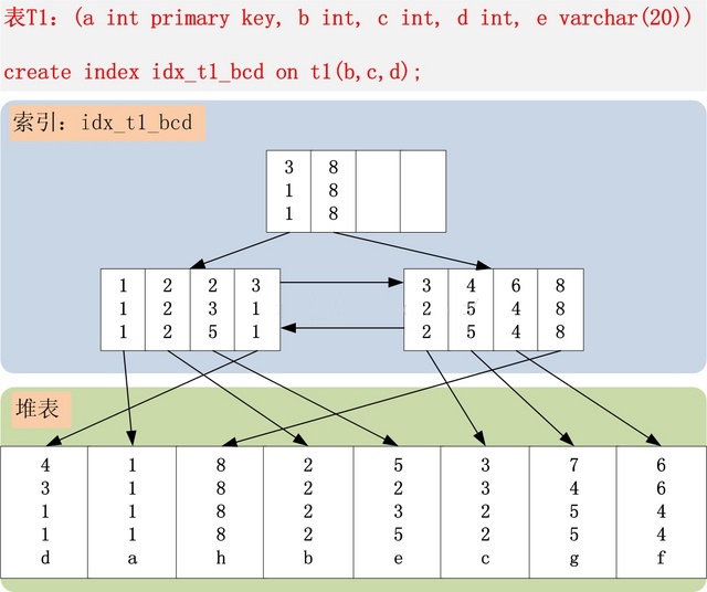 简单分析一下上图,idx_t1_bcd索引上有[b,c,d]三个字段(注意:若是InnoDB类的聚簇索引表,idx_t1_bcd上还会包括主键a字段),不包括[a,e]字段。idx_t1_bcd索引,首先按照b字段排序,b字段相同,则按照c字段排序,以此类推。记录在索引中按照[b,c,d]排序,但是在堆表上是乱序的,不按照任何字段排序。