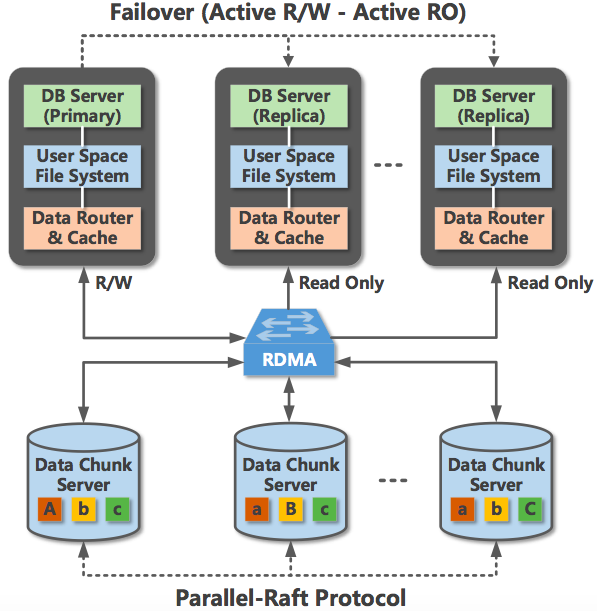 Server。同时DB Server之间仅需同步Redo log相关的元数据信息。Chunk Server的数据采用多副本确保数据的可靠性,并通过Parallel-Raft协议保证数据的一致性。