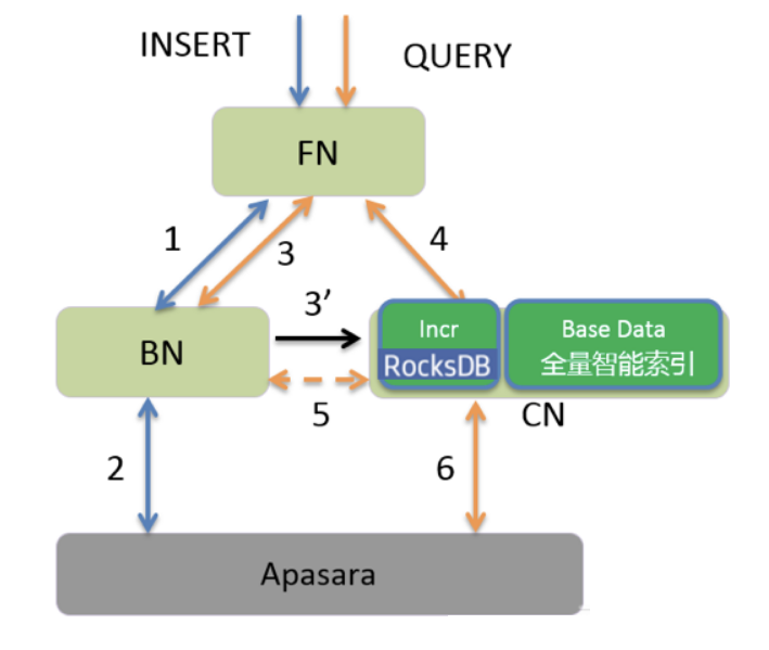 蓝色线代表写入链路,橙色线代表读取链路。以一次写入和读取为例,当用户新写入某表的数据后,立即发起查询,此时FN会收集该表在所有BN上的最新写入版本号(step