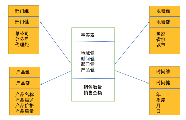 星型模是一种多维的数据关系,它由一个事实表和一组维表组成。每个维表都有一个维作为主键,所有这些维的主键组合成事实表的主键。强调的是对维度进行预处理,将多个维度集合到一个事实表,形成一个宽表。这也是我们在使用