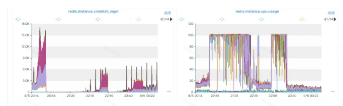 观察业务反馈使用的 MGET 和CPU负载,我们找到了对应的监控曲线。