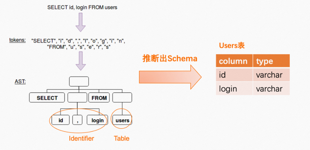 这里举一个最简单的SQL语句的例子,Select id,login from users,这条SQL语句经过词法分析和语法分析后,会对原始语句进行分词并构建出一棵抽象语法树,语法树里面就隐含了这条语句需要什么样的Schema,比如对于刚才这条SQL语句,我们就可以从语法树中推断出,需要从users表里面,读取id和login这两列,类型分别是varchar,这就是这条语句所需要的schema信息。
