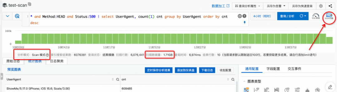 and Status:500”(Method字段和Status字段开启了索引)过滤后有600万条,则扫描过程是针对这600万条数据进行的,扫描数据量是统计的实际扫描的数据量大小。
