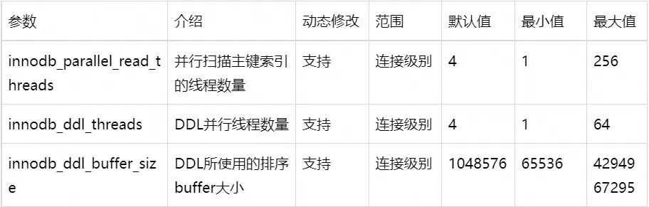 innodb_ddl_buffer_size/innodb_parallel_read_threads,因此当增大innodb_parallel_read_threads大小时,也需要增加innodb_ddl_buffer_size大小。